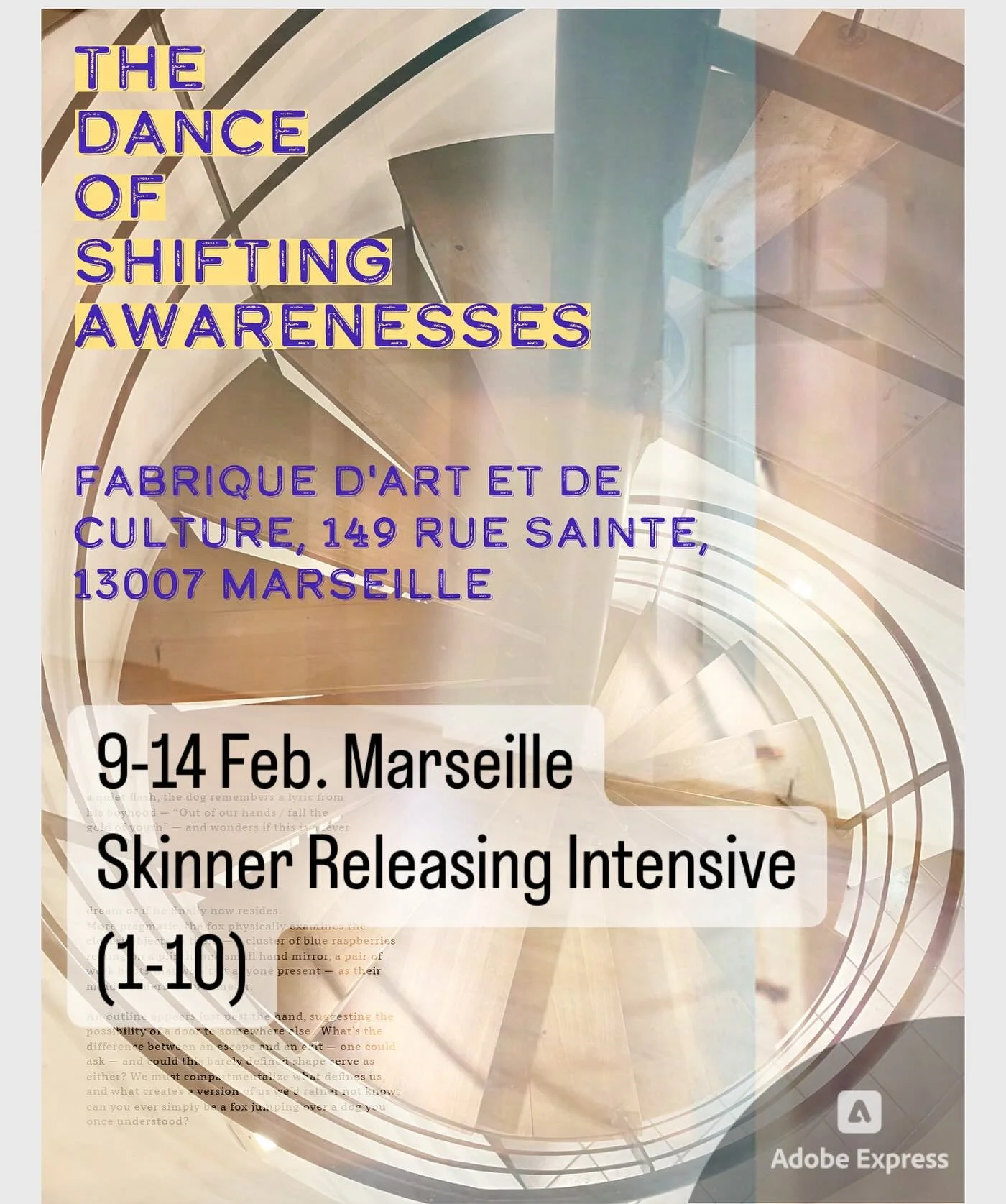 Skinner Releasing Technique (SRT) is a somatic practice and a pedagogical approach to movement developed in the late 1960s in the United States by dancer and educator Joan Skinner. At the crossroads of dance, improvisation, and guided imagery, SRT invites the release of unnecessary tension and the discovery of new ways of moving with ease, awareness, and creativity. It supports a shift from constrained voluntary control toward a state where movement arises almost on its own—often with more clarity, power, and subtlety.